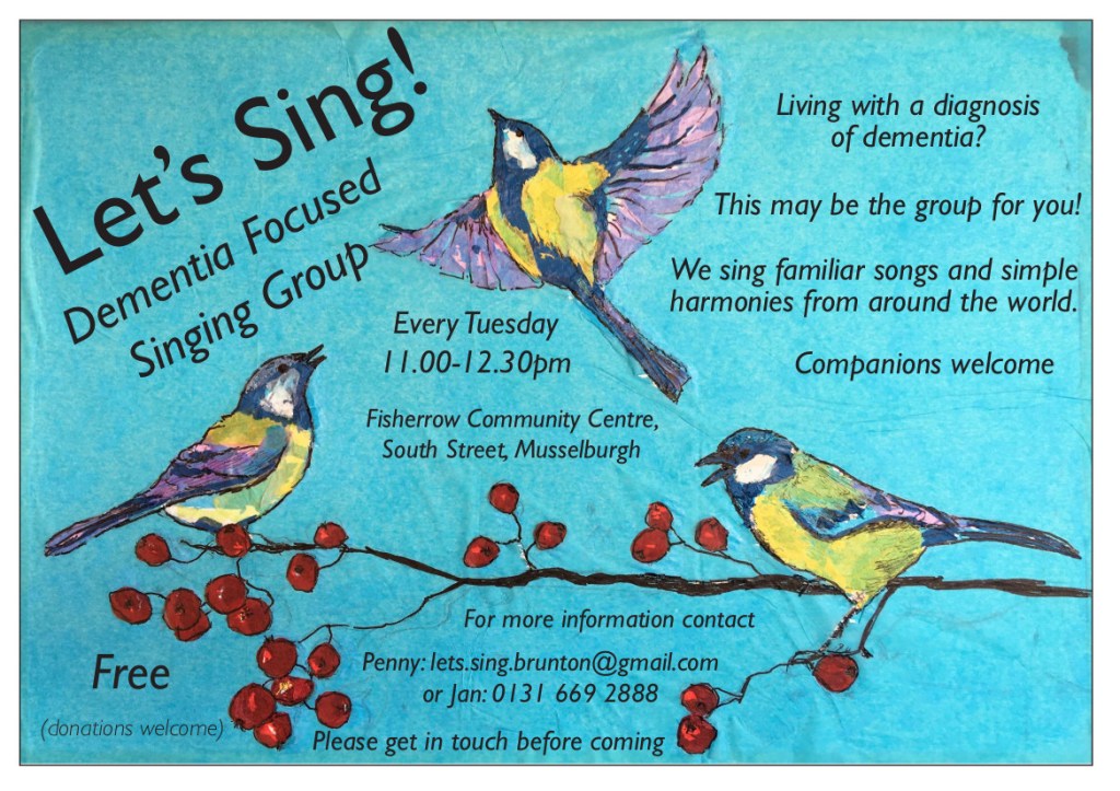 Let’s Sing is a dementia focused community singing group meeting at the Fisherrow Centre in Musselburgh on Tuesdays from 11am-12.30 every week during term time. We learn new songs together and are primarily focused on supporting people in the early-mid stages who are still living in the community. Friends and supporters are very welcome, and we believe that everyone can sing. Please do get in touch before you come along, as we’re quite full just now and like to speak with people before they come along so that you know what to expect and we can be ready to welcome you. Our songleader Penny can be emailed on lets.sing.brunton@gmail.com, or our chairperson Jan can be phoned on 0131 660 2888.