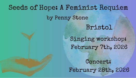 The Seeds of Hope Requiem was written by Penny Stone in memory of her amazing feminist mum, Sue Stone, and brings together the words of women from all over the world, spanning from 575 CE until the present day. The requiem is sung in 18 languages and combines a variety of community choir, semi-chorus and soloist acapella singing with cello, violin, percussion and French horn. There are also some singing-together choruses for the audience to join in with that will be taught at the beginning of the concert. There is space in this piece for singing and listening, for sadness and joy, and for connection as well as time spent with our own individual feelings.